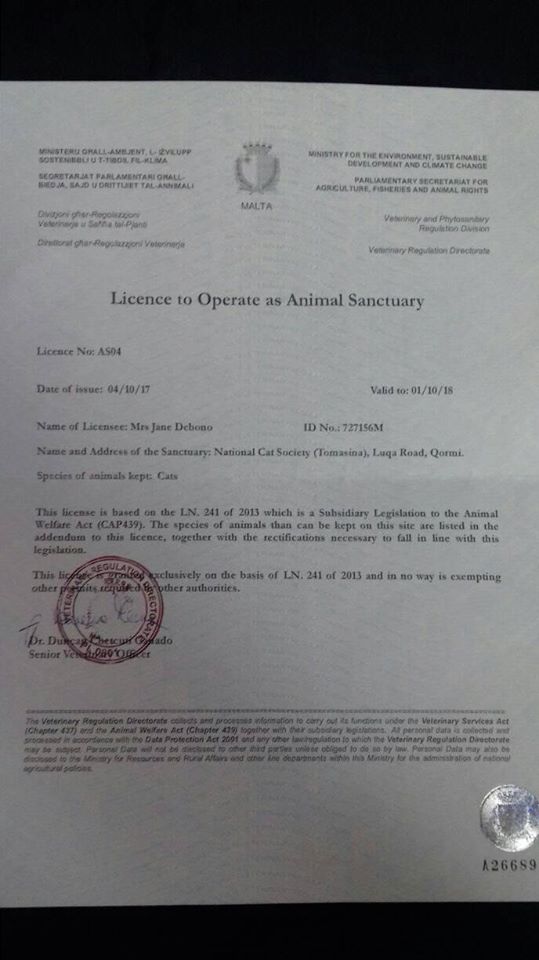 All volunteers of Tomasina Cat Sanctuary are proud to have now been officially recognised by the government as an animal sanctuary and can operate so accordingly.